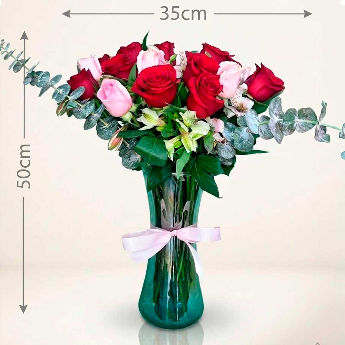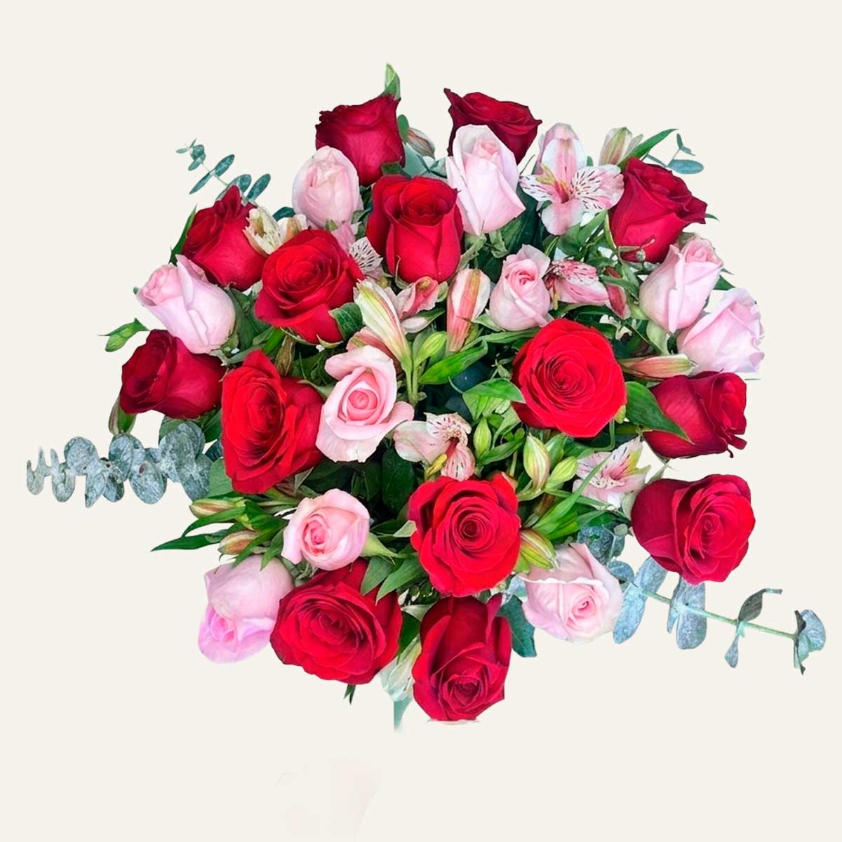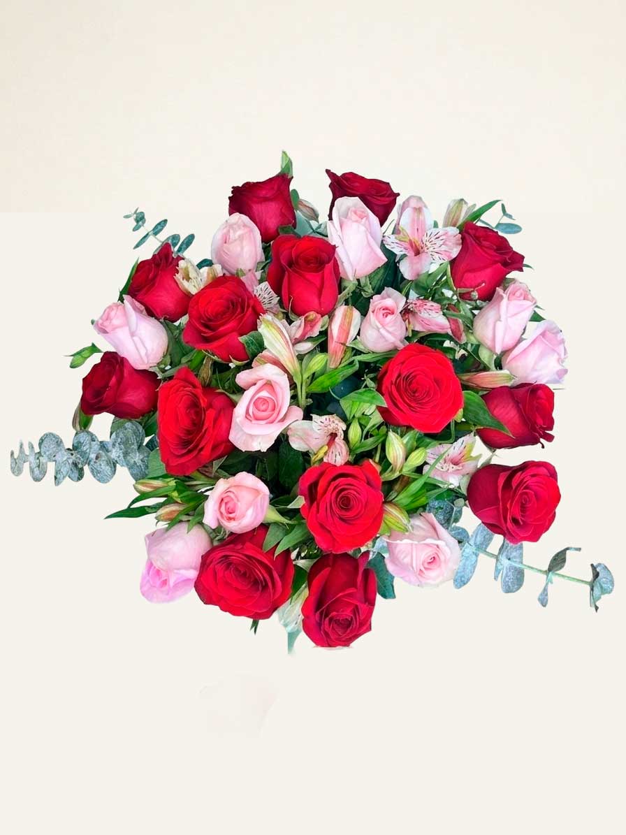 Espectacular diseño en florero de vidrio que combina la pasión de 25 rosas rojas y rosas. Acompañado de delicadas astromelias y follaje de eucalipto dólar, creando un contraste fresco y sofisticado. Perfecto para expresar sentimientos profundos.