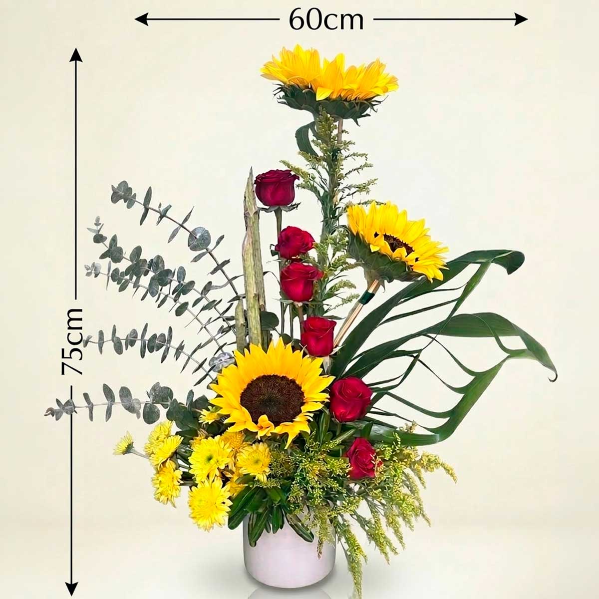 Elegante arreglo floral con girasoles y rosas rojas, acompañado de follaje fresco y flores amarillas. Ideal para regalar en cumpleaños, celebraciones o para sorprender a alguien especial con flores a domicilio.